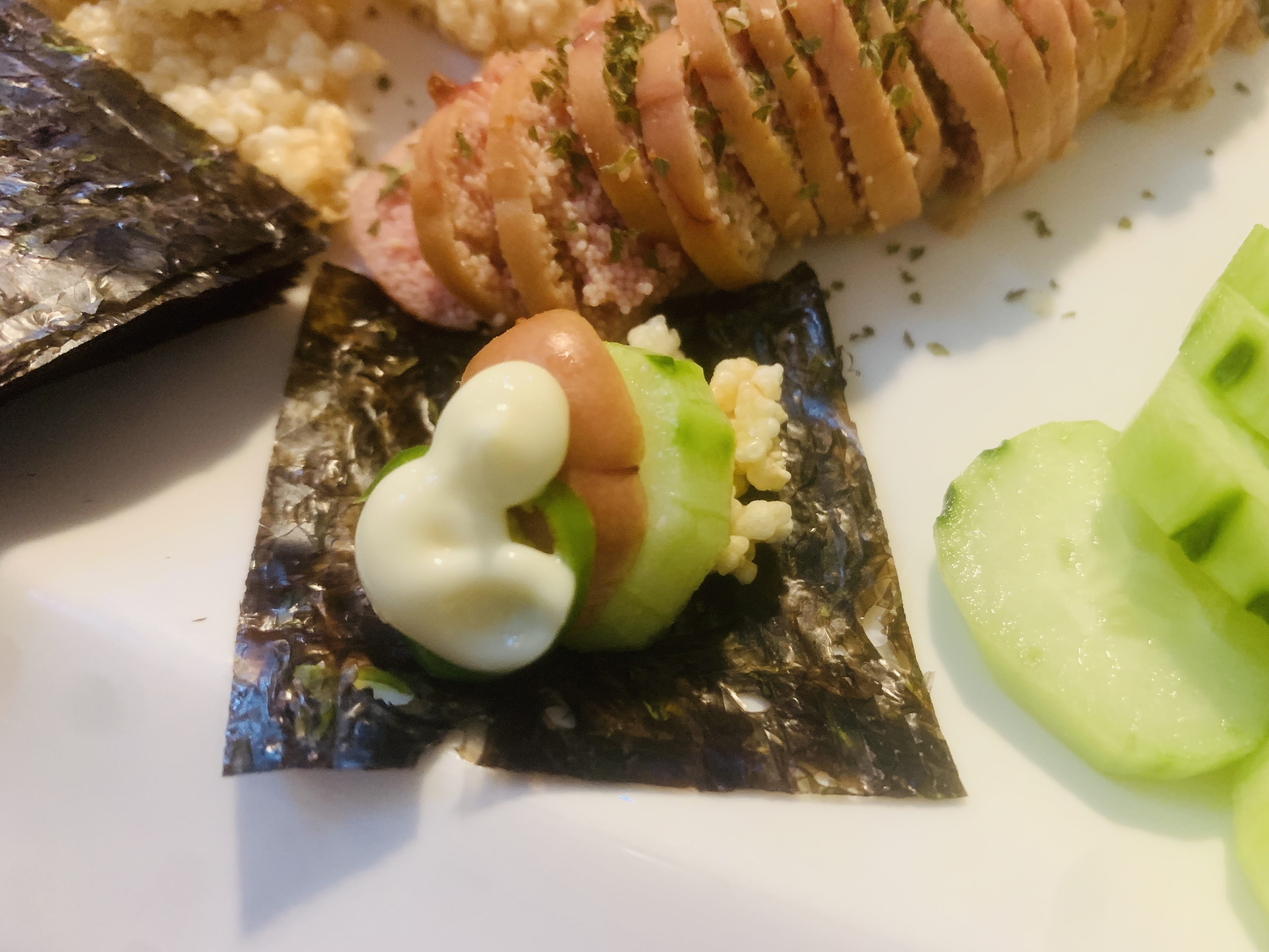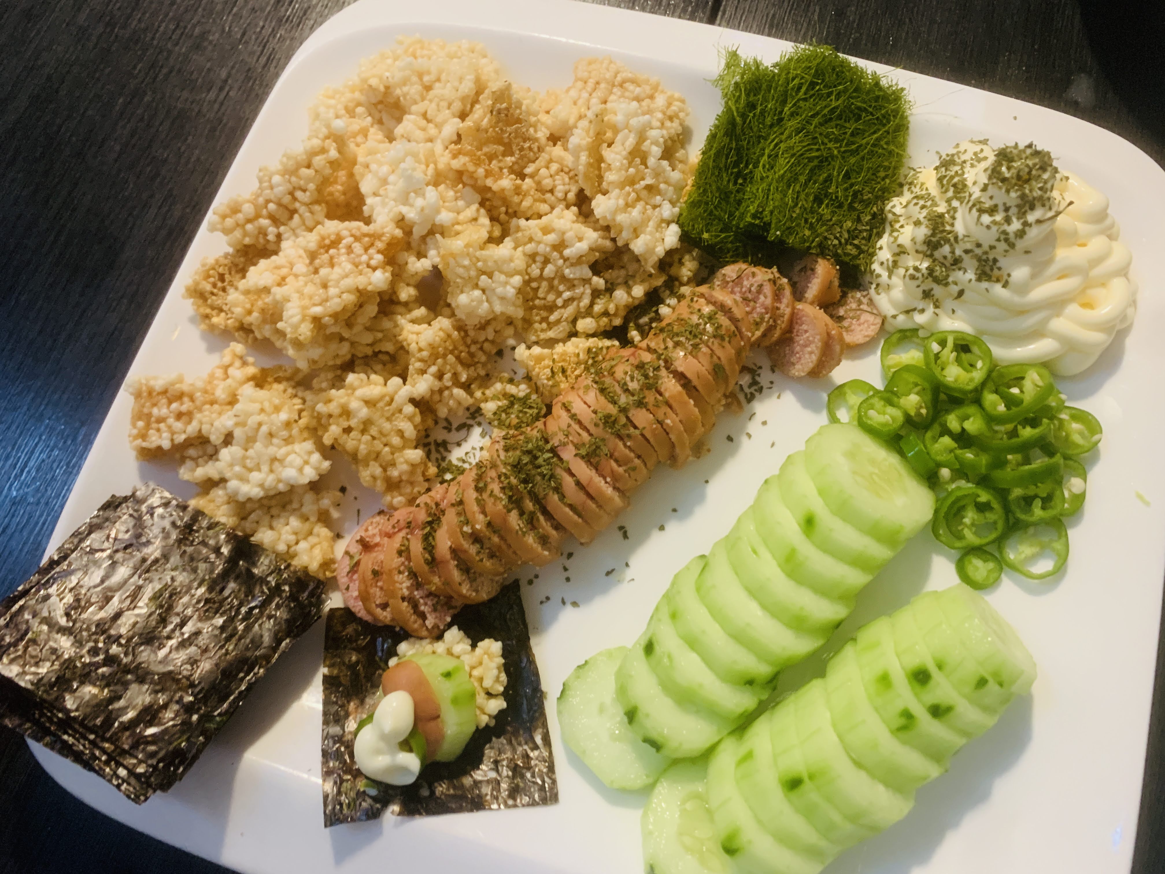 사장님께서 직접 튀기신 누룽지와 감태, 김, 오이, 명란, 마요네즈, 청양고추의 조합...맛이 상상되시는지요? 아마 여러분의 상상 그 이상의 맛일겁니다. 하나씩 쌓아서 한입 가득 물었을 때 누룽지의 바삭함 뒤에 꼬소함과 짭조름함, 상큼함과 매콤함, 이유를 알 수 없는 향긋함까지..손이 멈추지 않았습니다. 진짜 진짜 맛있었습니다.