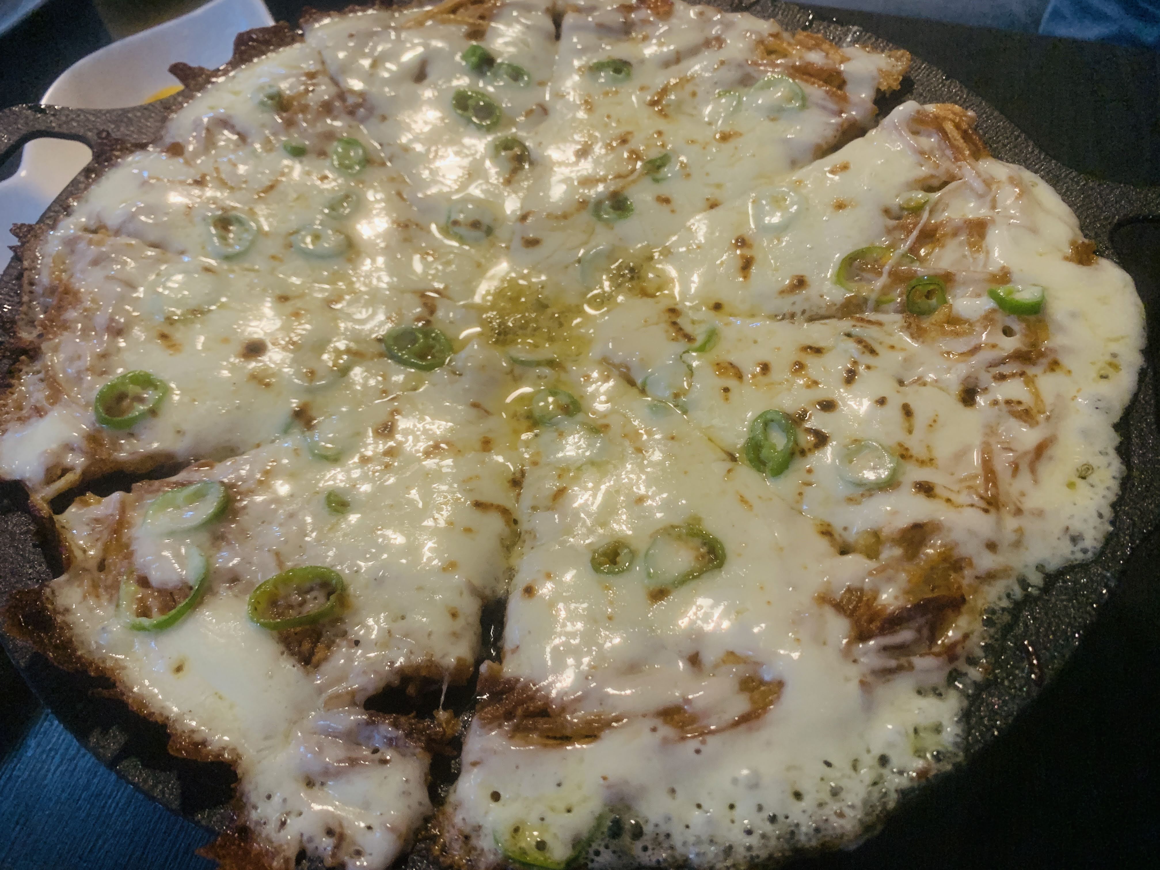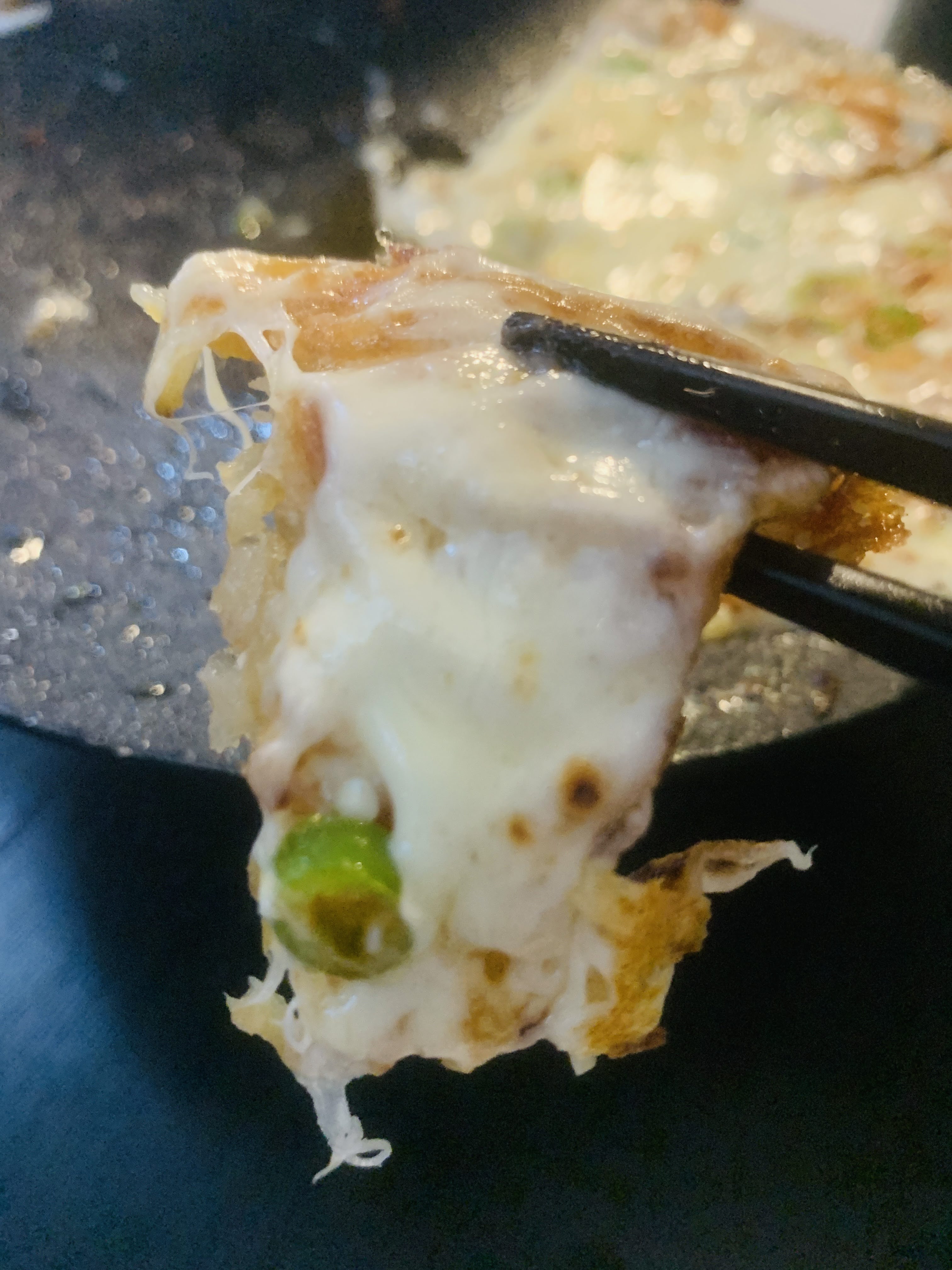 사실 치즈감자전이라 하여 느끼할 것이라 예상했습니다. 쭈~~욱 늘어지는 치자와 얇게 펴 노릇하게 잘 구워진 감자전을 같이 먹었는데, '어라 이 맛은?' 전혀 느끼하지 않았습니다. 느끼함을 잡아주는 기분좋은 매콤함이 있었습니다. 얇에 쓴 청양고추였습니다.