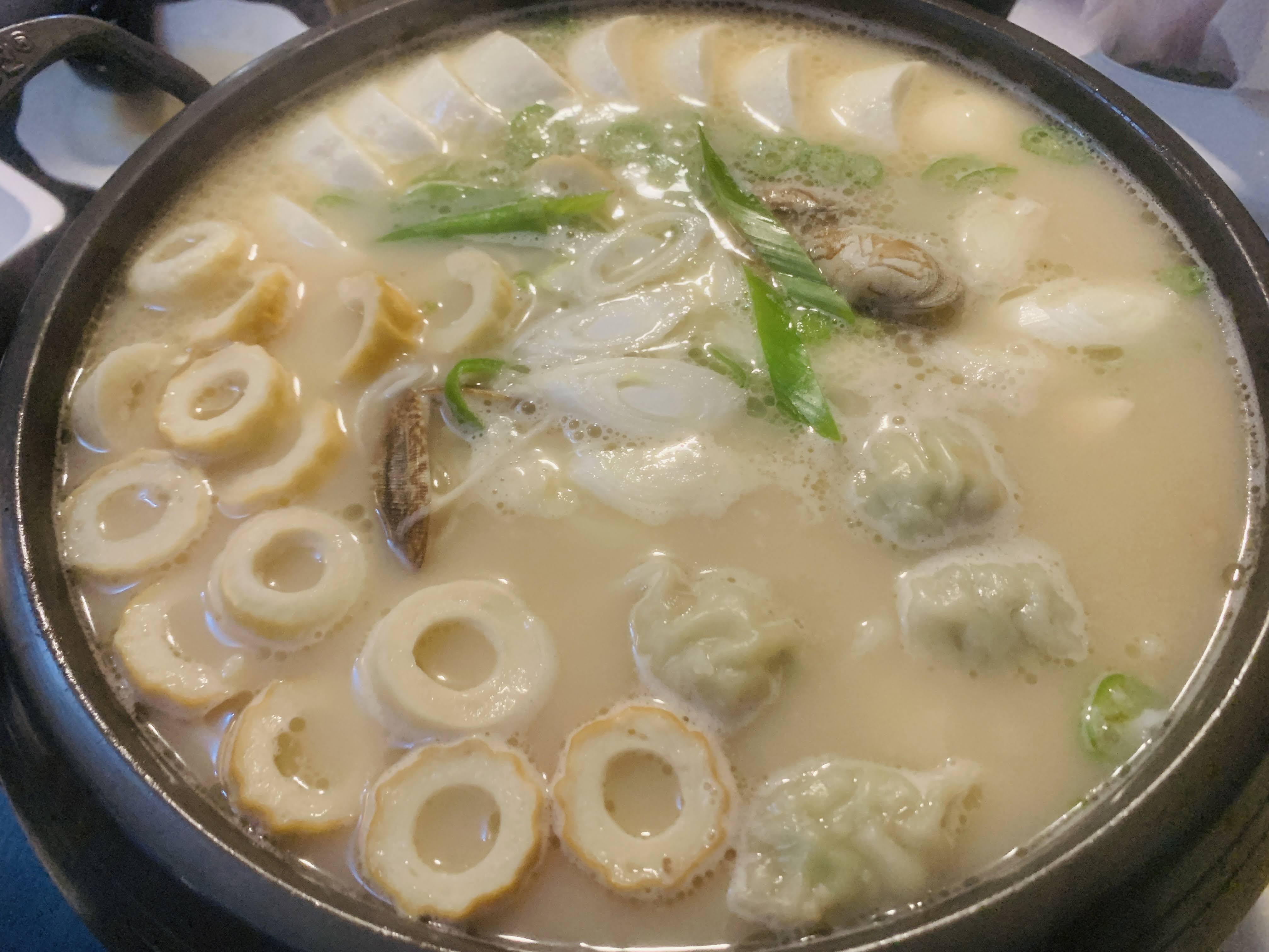 "국물이 왜 이렇게 맑지?" 보통 때 먹어본 순두부탕이 아니었습니다. 보시면 알겠지만 어묵, 만두, 수제비, 청양고추, 순두부, 바지락, 대파가 들어간 탕입니다.