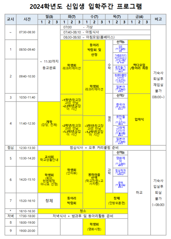 김해금곡고의 입학식은 일반학교와 다릅니다. 보통 3월 4일, 학교 등교하는 날 입학식을 많이 하는 데 김해금곡고는 3월 8일, 금요일에 입학식을 했습니다. 물론 신입생들은 3월 4일 등교했습니다. 등교하여 5일간 학생회에서 준비한 행사와 선생님들이 준비한 학교 소개 프로그램에 참여합니다. 신입생들은 작년에는 중학교 최고 학년으로 생활했지만 고등학교는 처음이기에 적응의 시간을 확보하는 것입니다. 김해금곡고의 개학 첫번째 시간표를 소개합니다.