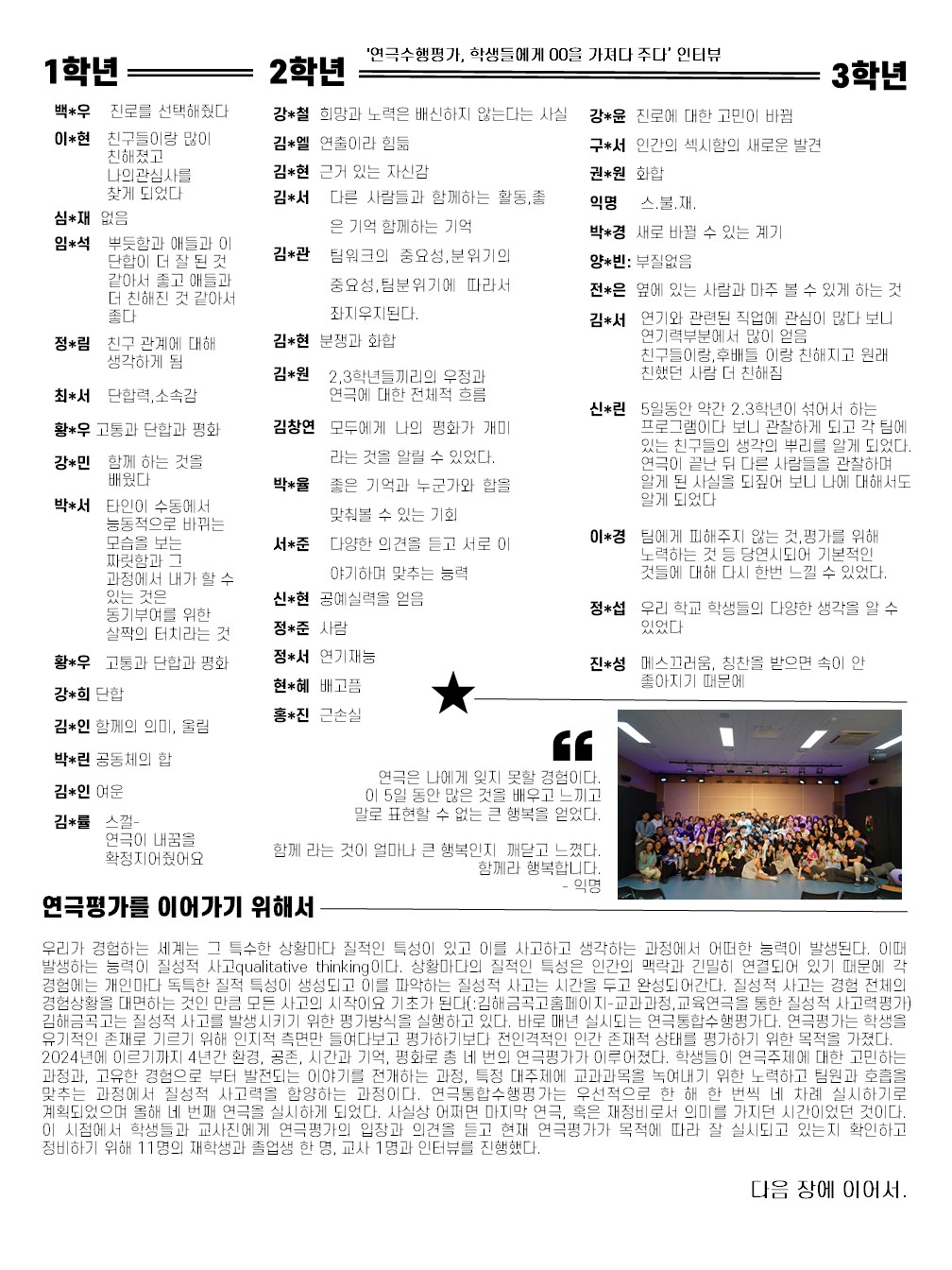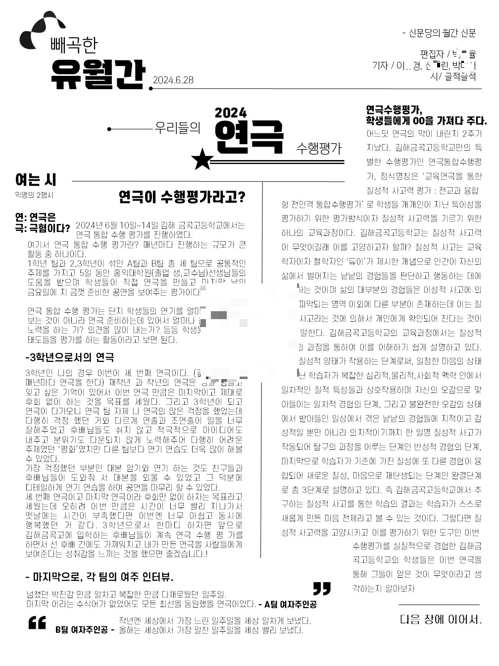 김해금곡고 신문동아리인 신문당은 해서 6월 신문 주제를 '연극수행평가'로 잡았습니다. 그 결과물을 소개합니다.