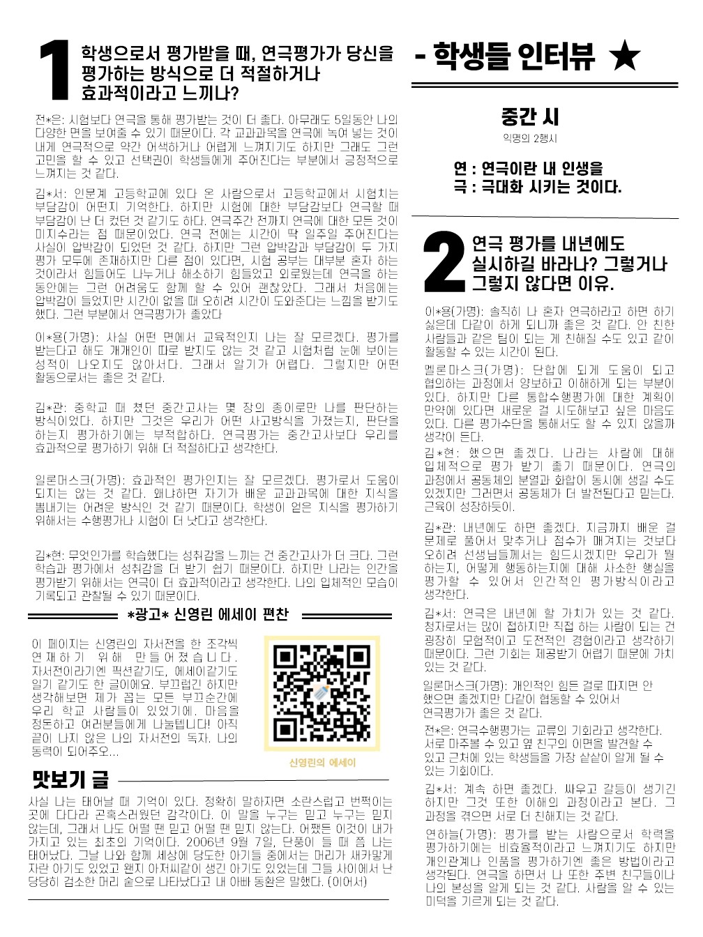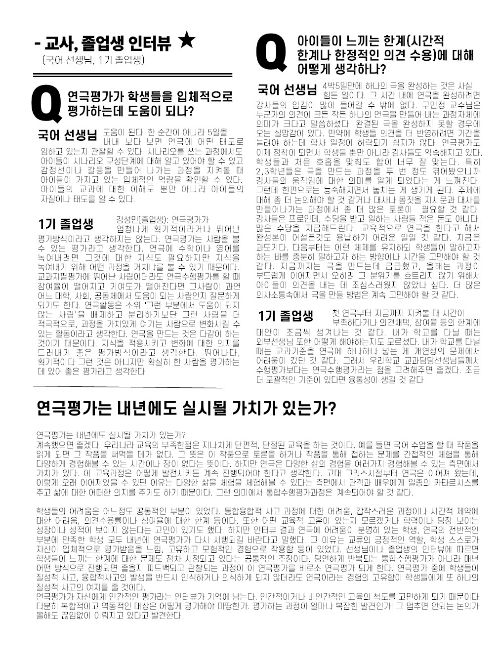 글씨가 잘 보이는 지 모르겠습니다. 자랑은 아니지만 감히 말씀드립니다. 저는 지도교사지만 위 신문 제작에 1도 관여하지 않았습니다. 학생들이 동아리 시간에 모여 회의하고 각자 역할을 분배해서 인터뷰하고 글을 직접 쓰고 편집까지 해서 발행한 것입니다. 저도 학교 게시판에 붙어 있는 것을 읽어보고 내용이 너무 좋아 이렇게 소개글을 씁니다. 저는 이것이 지도교사의 역할(?)이라고 생각합니다. 학생들이 훌륭히 해내는 것을 알려내는 것이죠.^^