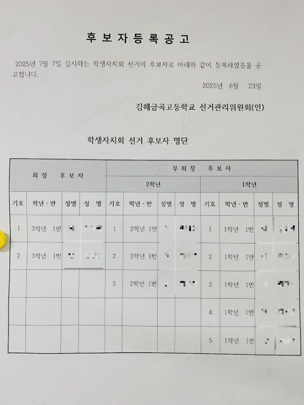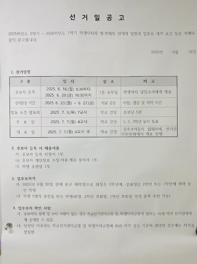 올해 학생회 선거는 치열합니다. 회장 후보 2인, 2학년 부회장 후보 3인, 1학년 부회장 후보는 자그마치 5명이 출마했습니다. 2025년 7월 4일 현재 전교생이 41명인 것을 감안하면 전교생의 25%가 출마했다는 뜻입니다. 그만큼 학교에 애정 있는 학생들이 많다는 뜻으로 좋게 해석합니다.^^;