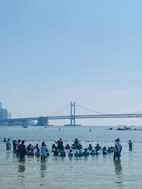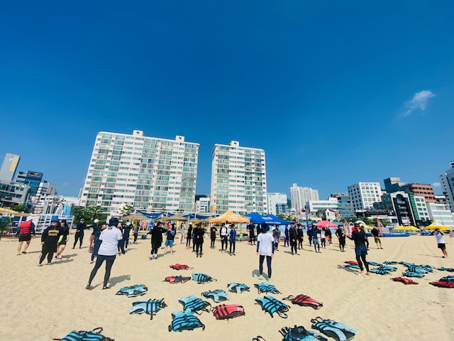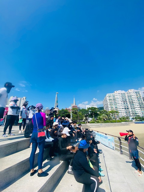 8월 19일, 아침일찍 급식소에서 밥을 먹고 8시 30분에 광안리로 출발했습니다. 상당히 뜨거운 날이었습니다. 학생들은 학교에서 미리 안내한 복장과 준비물을 챙겨서 진지하게 배움에 임했습니다.. 생존수영을 배우기 전 강사선생님의 주의사항을 듣고 있습니다.